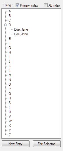 The tree gadget sorting is based on one of three indexes.  The Standard index which is highlighted here, will consist of each record being indexed on the Name Line, City, State.  Thus if I were to have multiple addresses for say Aetna with one in Anchorage AK, Fairbanks AK and another in Dallas TX, the indexing would be Aetna with the Anchorage AK address listed first, the Fairbanks AK address listed second and finally the Dallas TX address last.  You will not actually see the City, State in the Tree Listing, just Aetna, Aetna, and Aetna.   Of course you could change the Indexed As field to read "Aetna (Anchorage)", "Aetna (Fairbanks)" and "Aetna (Dallas)".  In which case you would now see the "City" portion in the tree listing.  The Indexed as field is free-form.  Similarly, Alt 1 and Alt 2 work the same way.  These two alternative indexes would be "Activated" by simply checking the approptedly named check-box "Alt 1" or "Alt 2".