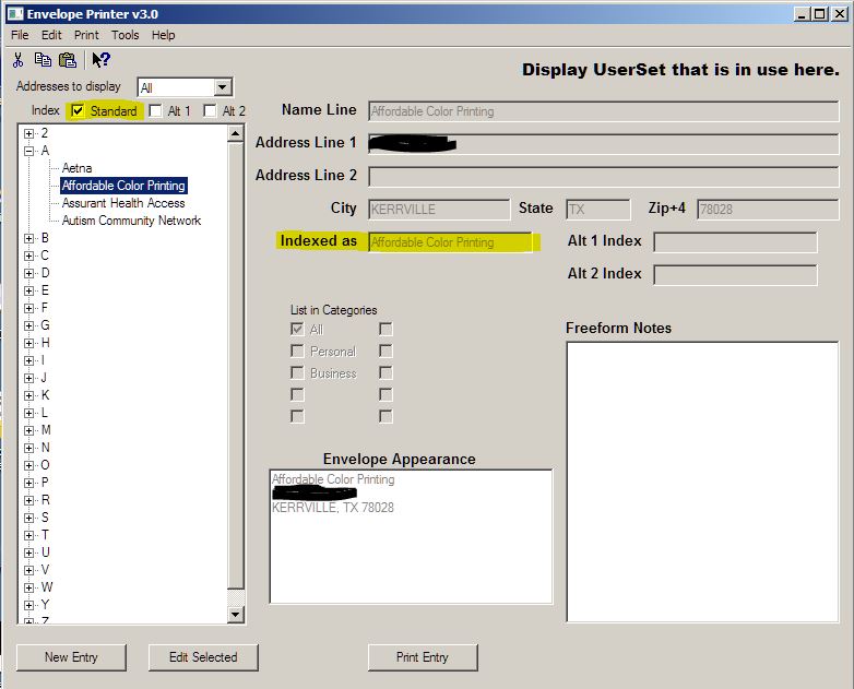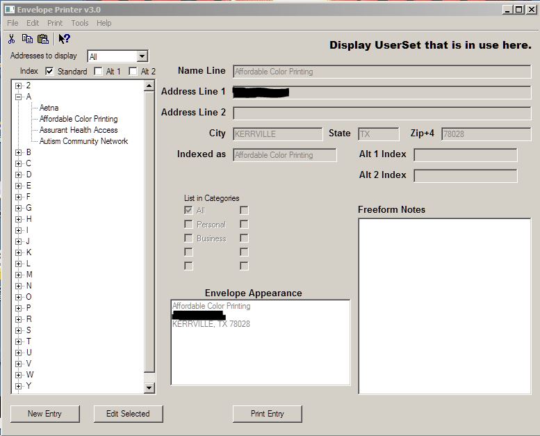 Again, the UserSet will include return address information, a bitmap/jpeg logo that will display/print to the left of the Return address, default font's to be used, default printer, envelope paper size, etc.  Each address in the address book will be associated to a UserSet.  Therefore, you could think of each UserSet as being it's own address book within the address book.  However, one address entered under one UserSet will not be available for printing under a different UserSet.  The address would have to be entered into each UserSet in order to be present in that UserSet's list of addresses.  I am thinking about providing an option that will allow the use of "independent" address books by UserSet to be turned on and off.  If turned off, then all addresses will be associated with all UserSets and the UserSet would not be used as another filtering mechanism.  If turned on, then the UserSet is just another filtering mechanism associating a specific return address to specific entries in the address book.